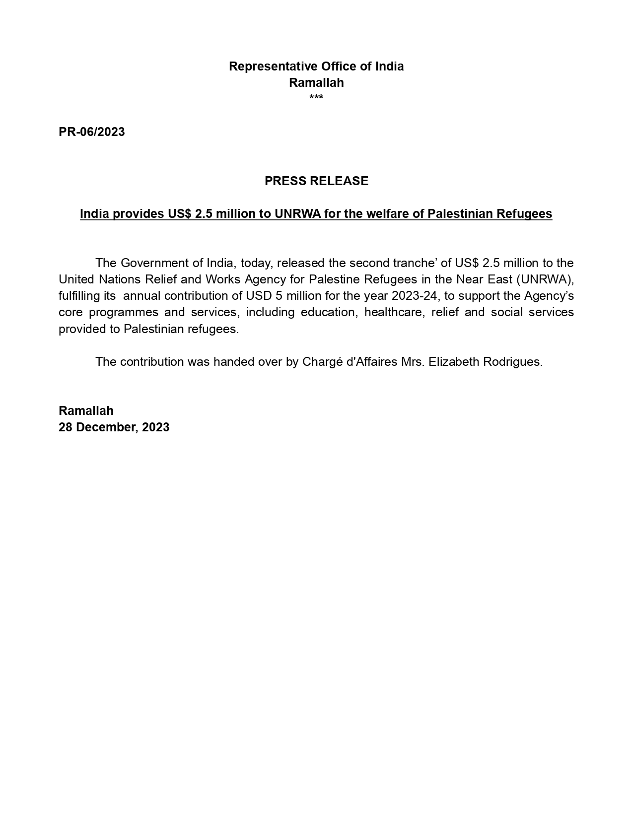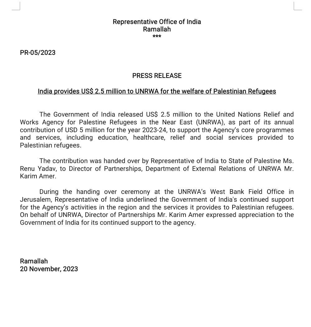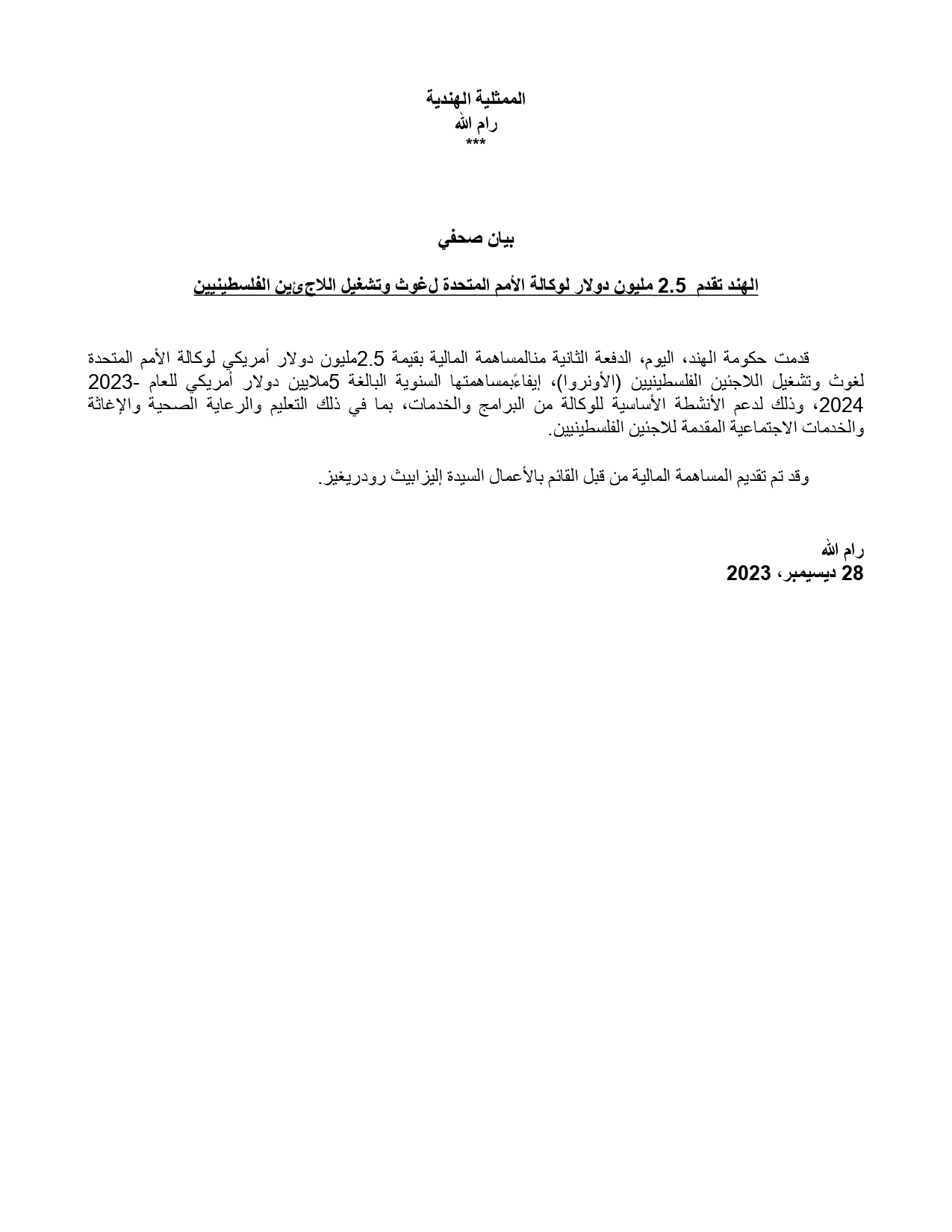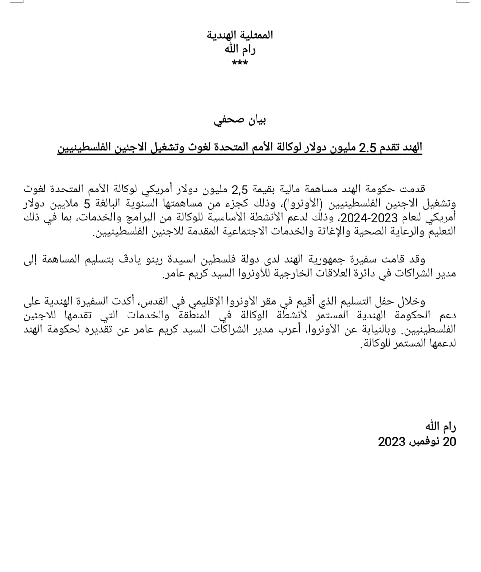 الهند تقدم 2.5 مليون دولار لوكالة الأمم المتحدة لغوث وتشغيل اللاجئين الفلسطينيين
