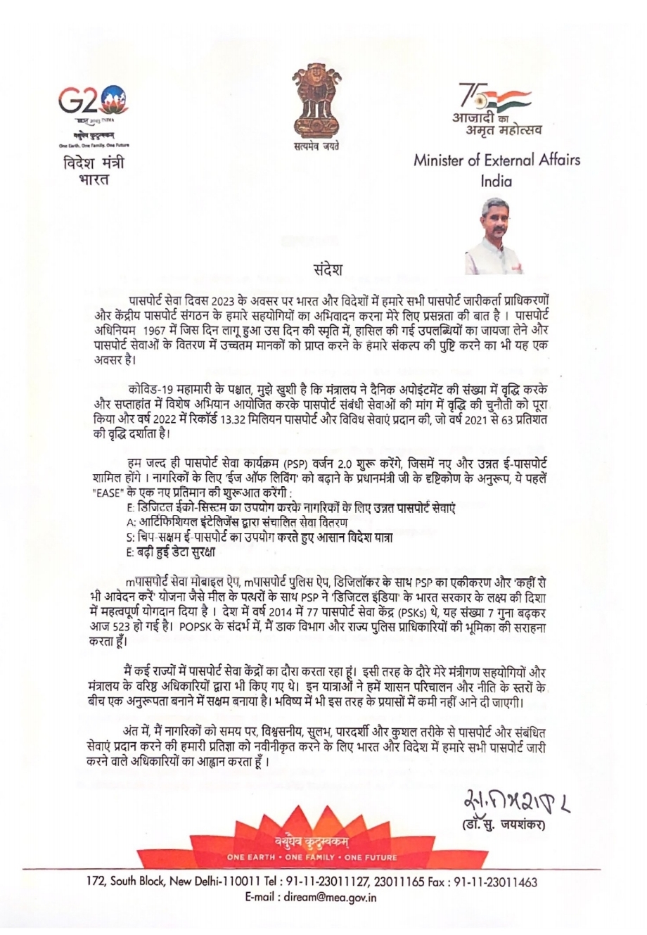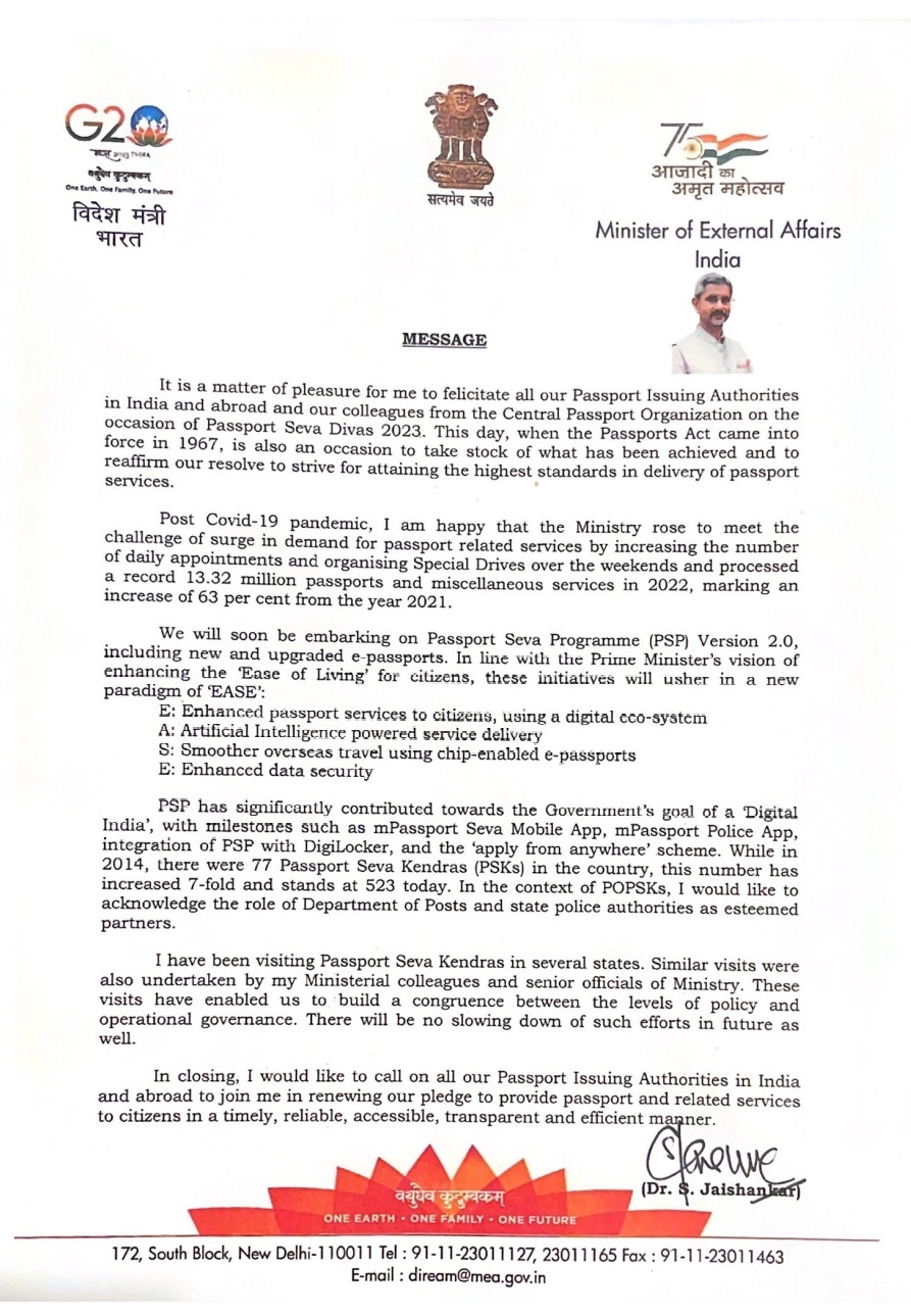 Message of Hon'ble External Affairs Minister Dr. S. Jaishankar on the occasion of Passport Seva Divas 2023