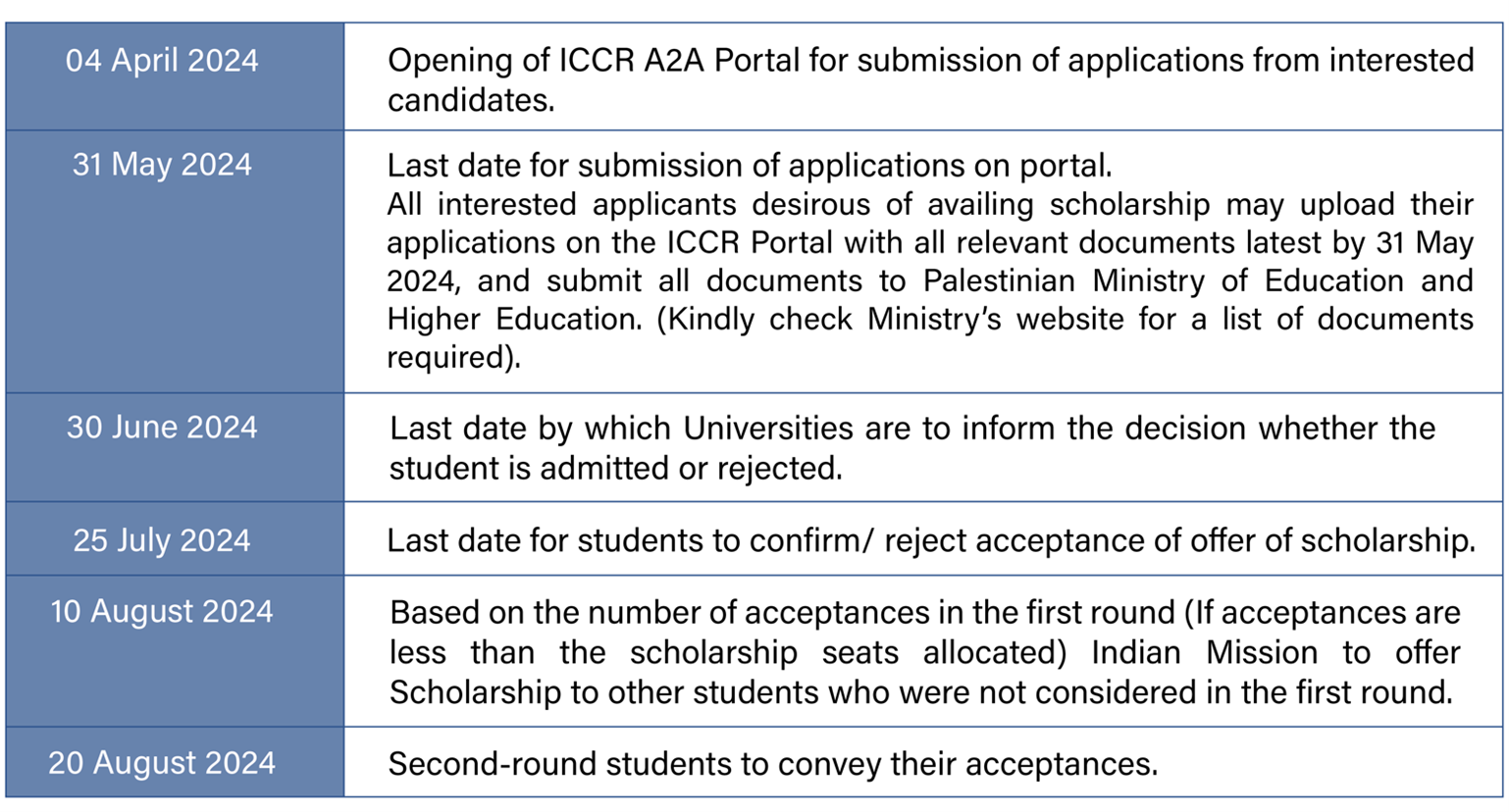 1. The Representative Office of India, Ramallah invites applications from Palestinian nationals for award of Atal Bihari Vajpayee General Scholarship Scheme (A1201) (formerly General Scholarship Scheme) for graduate, post-graduate and Ph.D courses for the Academic Year 2024-25.