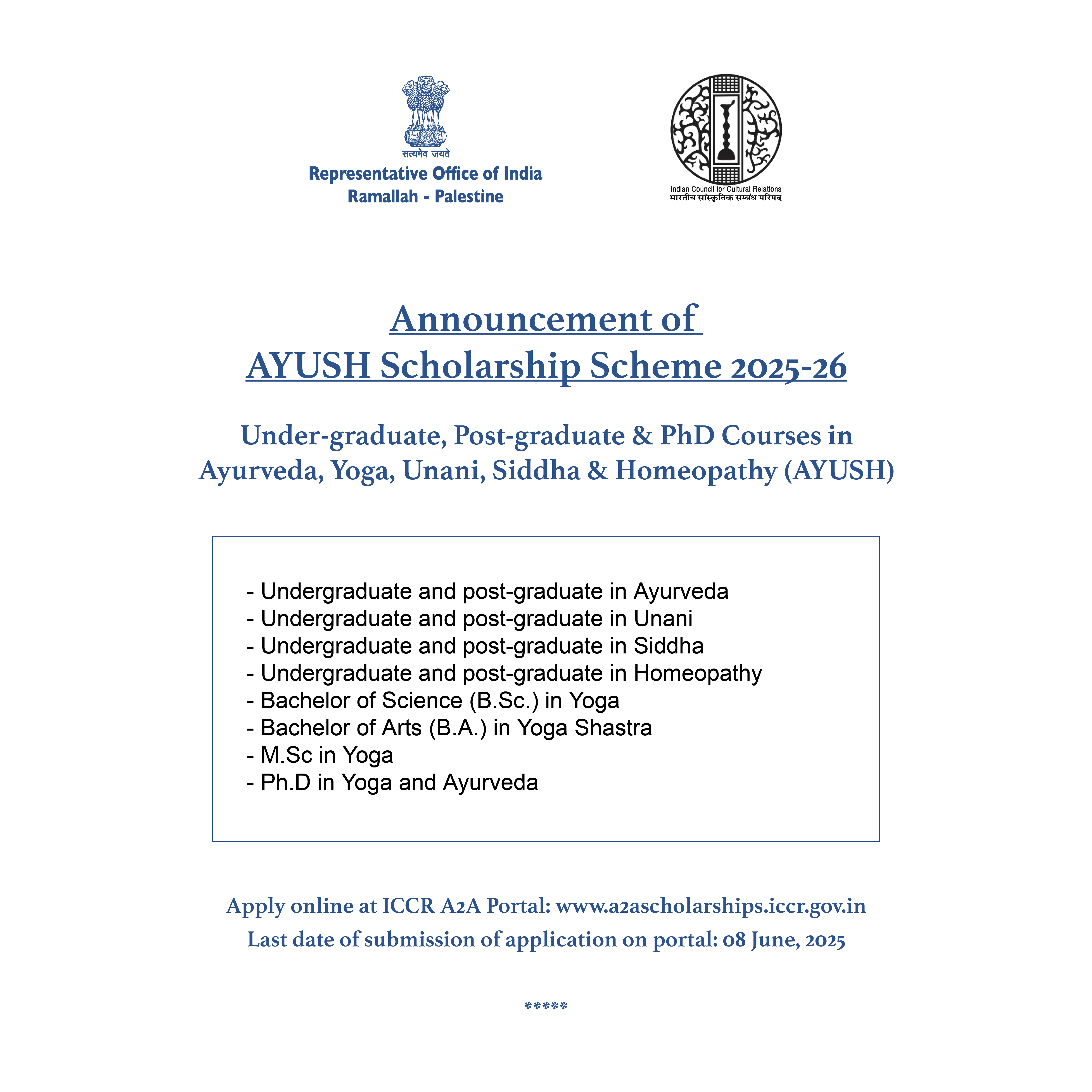 Announcement of ICCR scholarship slots under AYUSH Scholarship Scheme for the Academic Year 2025-26