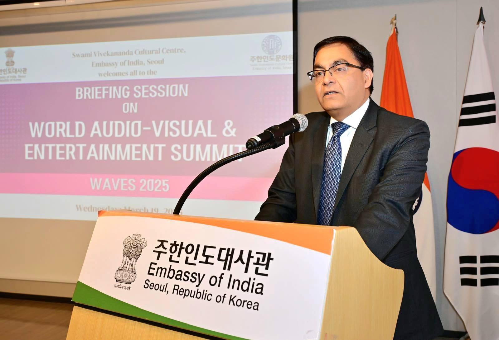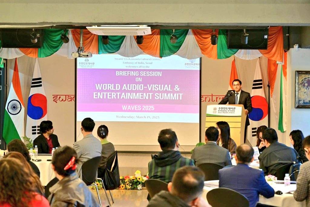 The Embassy of India organized a briefing session on the upcoming World Audio – Visual and Entertainment Summit (#WAVES 2025) for Korean participants from Media & Entertainment industry on 19 March 2025 at Swami Vivekananda Cultural Centre (SVCC).