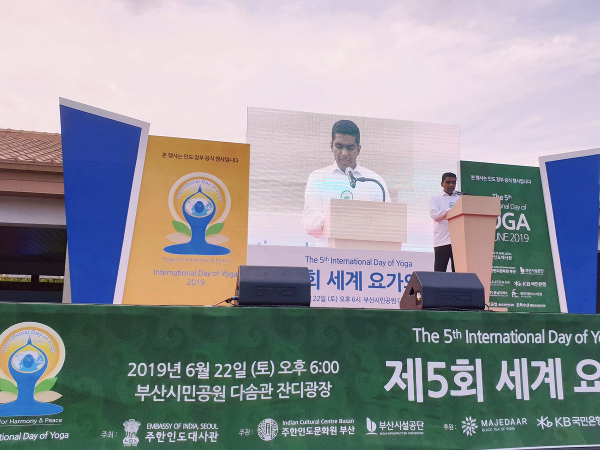International Day of Yoga 2019 celebrated with great vigour at Busan Citizens Park. People listened to Prime MInister Narendra Modi's message. Deputy Chief of Mission participated.