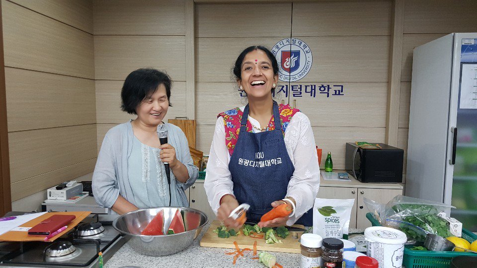 8ì›” 3ì¼, 주한ì¸ë„ë¬¸í™”ì› ì†Œë§ˆ ë”ë”° ì„ ìƒë‹˜ì€ ì›ê´‘디지털대학êµì—서 ì•„ìœ ë¥´ë² ë‹¤ ìŒì‹ì— 대한 ê°•ì—°ì„ ì§„í–‰í•˜ì˜€ìŠµë‹ˆë‹¤. 36ëª…ì˜ í•™ìƒë“¤ì´ 참가해 ì—¬ë¦„ì„ ìœ„í•œ ì•„ìœ ë¥´ë² ë‹¤ ížë§ í‘¸ë“œì— ëŒ€í•´ ë°°ì› ê³ ì´ë¡ 설명 ë’¤ì— ì´ì–´ì§„ 요리 수업ì—서는 ì˜¤ì´ ìˆ˜ë°• 민트 ìƒëŸ¬ë“œ, ë§ˆì‚´ë¼ ë°¥, ê³ ìˆ˜ì™€ 민트 처트니를 만들어보았습니다.