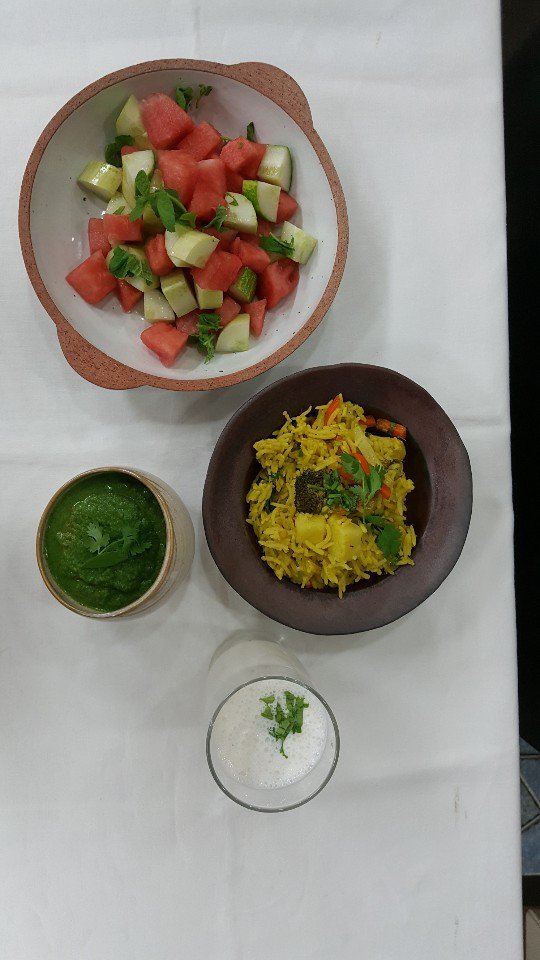 Ayurvedic healing food for Summer on 3 August - lecture followed by cooking demonstration and practice by 36 participants at Wonkwang Digital University and made Cucumber, watermelon and mint salad, Masala rice, masala lassi and coriander-mint chutney.