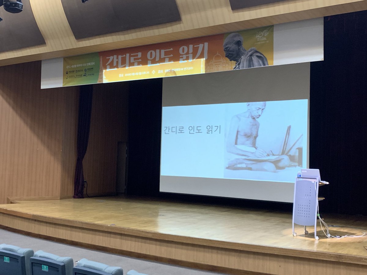 8ì›” 4ì¼, 다섯번째 ê°„ë”” ê°•ì—°ì´ ì²ì£¼êµë¦½ë°•물관ì—서 ì—´ë ¸ìŠµë‹ˆë‹¤. 80명 ì´ìƒì˜ ì‹œë¯¼ë“¤ì´ ì°¸ì„í–ˆê³ í•œêµì™¸ëŒ€ 김형준 êµìˆ˜ê°€ '간디로 ì¸ë„ ì½ê¸°' ê°•ì—°ì€ ì§„í–‰í•˜ì˜€ìŠµë‹ˆë‹¤. 마하바ë¼íƒ€ì— 대해 간략히 설명 후 ê·¸ ì•ˆì˜ ì‹œíŽ¸ '바가바드기타'ì— ëŒ€í•œ ì„¤ëª…ì„ í†µí•´ ê°„ë””ì˜ ì‚¬ìƒê³¼ ì¼ë°˜ì ì¸ ì¸ë„ì˜ ë¯¿ìŒì„ ì´í•´í• 수 있ë„ë¡ í•˜ì˜€ìŠµë‹ˆë‹¤. ë¹„ë¡ ê¸´ ì´ì•¼ê¸°ì˜€ì§€ë§Œ, êµìˆ˜ë‹˜ì˜ ìœ ë¨¸ëŸ¬ìŠ¤í•œ 강연으로 ì¦ê²ê²Œ ë“¤ì„ ìˆ˜ 있었습니다.