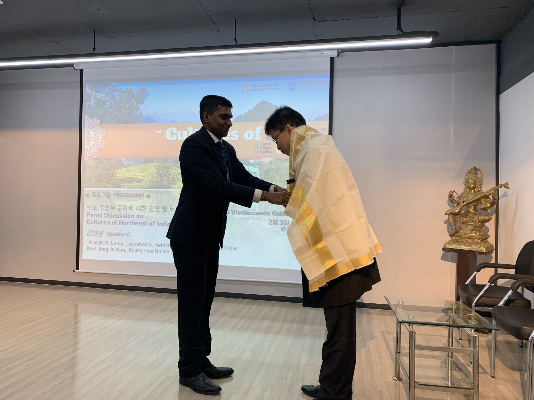 SVCC organised a Panel discussion on 'Cultures of Northeast India'. Professor M. P. Lama spoke on the 'Cultures of Northeast India' and Professor Jong-in Kim shared Korean perspectives on Indian Culture. Deputy Chief of Mission Shri Satish Sivan gave the congratulatory remarks and the session was moderated by Director, SVCC Dr. Sonu Trivedi. Event was followed by a cultural programme focusing on the theme of Northeast India.