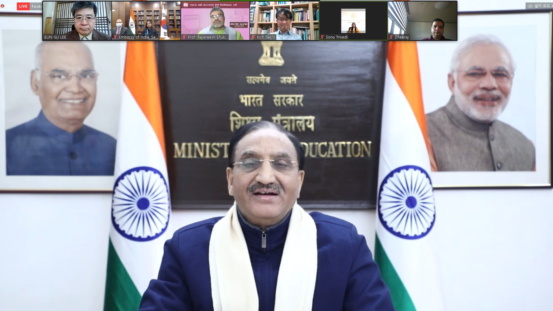 The event was graced by the presence of the Hon’ble Minister of Education, Government of India, Shri Ramesh Pokhriyal ‘Nishank’ as the Chief Guest along with H. E. Sripriya Ranganathan, Ambassador of India to Republic of Korea. The Symposium will also be attended by Prof. Rajneesh Kumar Shukla, Vice Chancellor, Mahatma Gandhi Antarrashtriya Hindi Vishwavidyalaya, Wardha, Prof. Koh Tae Jin, Director, Centre for Critical Foreign Language Education, Hankuk University of Foreign Studies, Prof. Lee Eun-Gu, Dean, Department of Indian Studies, Hankuk University of Foreign Studies and Dr. Sonu Trivedi, Director, Swami Vivekananda Cultural Centre, Seoul.