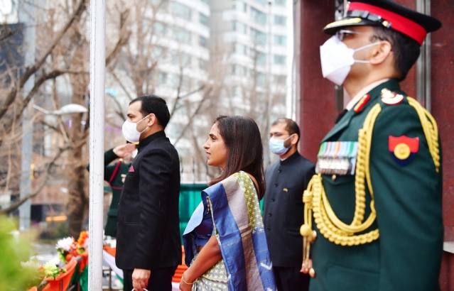 Embassy of India, Seoul celebrated the 72nd Republic Day on 26 January 2021, where Ambassador Sripriya Ranganathan unfurled the national flag at the Embassy premises. Physical attendance were limited, to abide by the local Government's COVID-19 related social distancing norms in Seoul. The majority of the community members, and friends of India in Korea joined the event online which was broadcasted live on Embassy’s social media pages and handles.