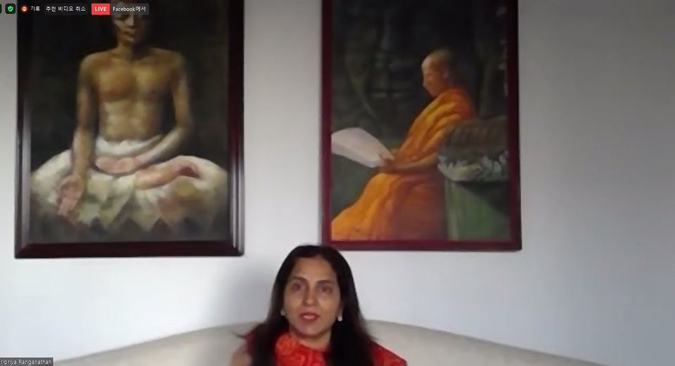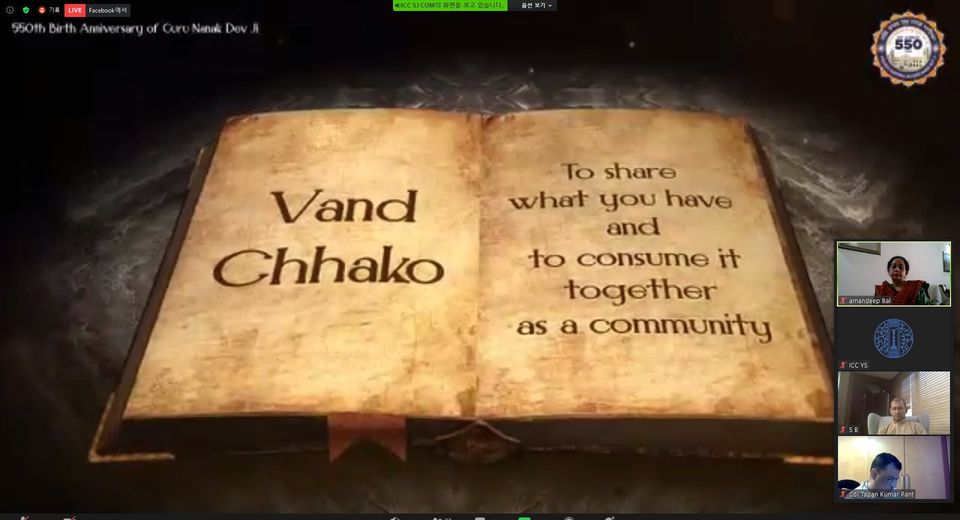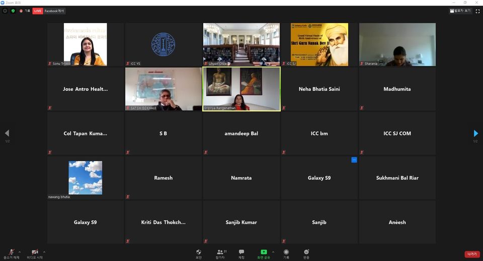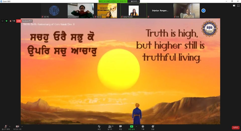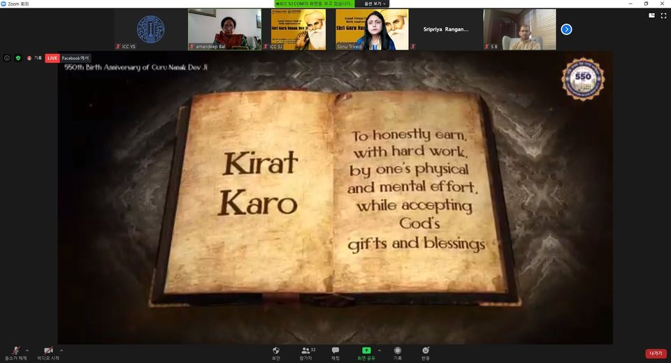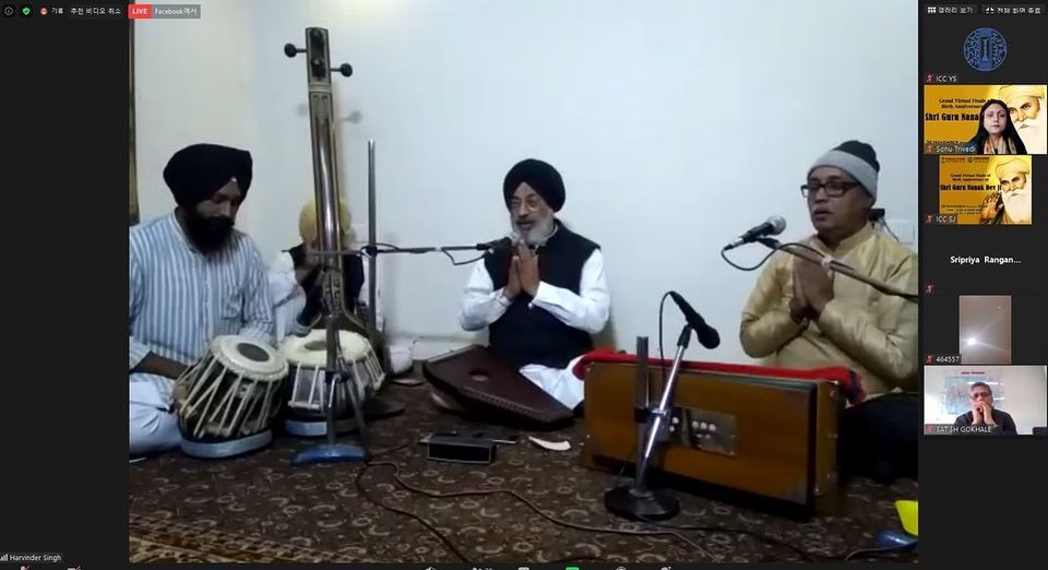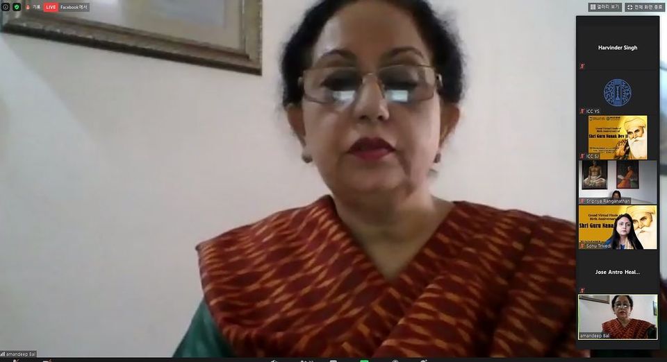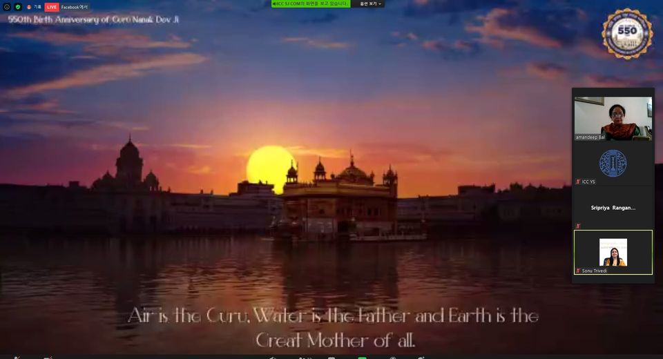 Grand Virtual Finale of Birth Anniversary of Guru Nanak Dev ji was held on 30 November 2020 via Video Conference. Congratulatory Remarks by H.E. Sripriya Ranganathan, Ambassador of India to the Republic of Korea was delivered. The programmed included Katha on Guru Nanak Dev ji by Sardar Jagmohan Singh, Kirtan by Prof. Harvinder Singh, Faculty of Design & Arts, Panjab University, Lecture by Prof. Mrs. Amandeep Bal, Dept of History, Guru Nanak Dev ji University and Documentary commemorating the teachings of Guru Nanak Dev ji.