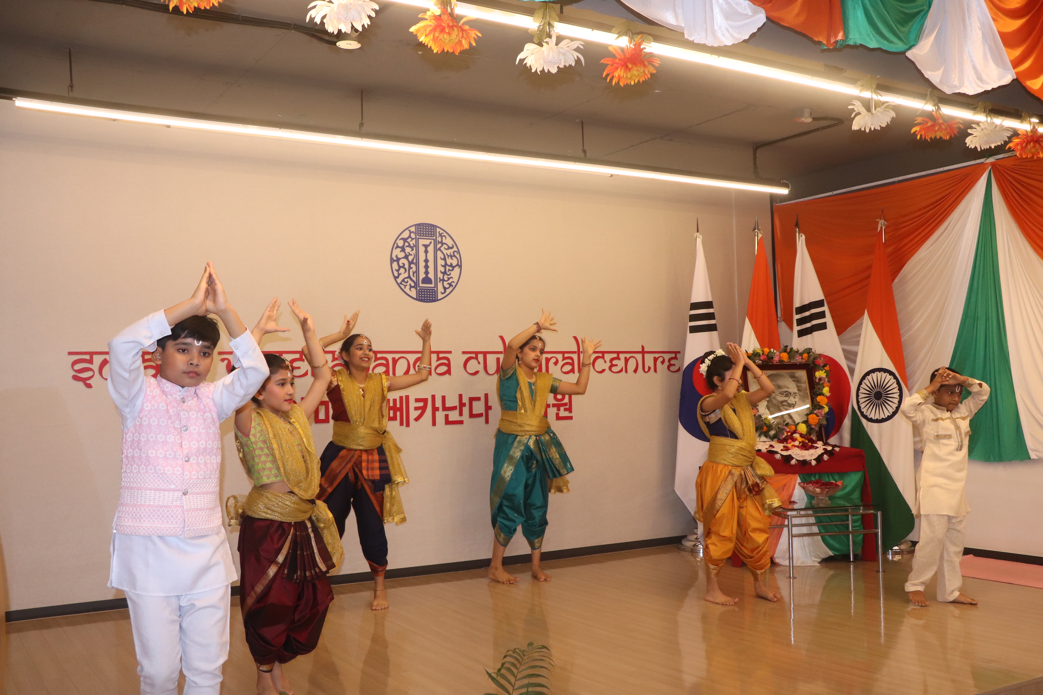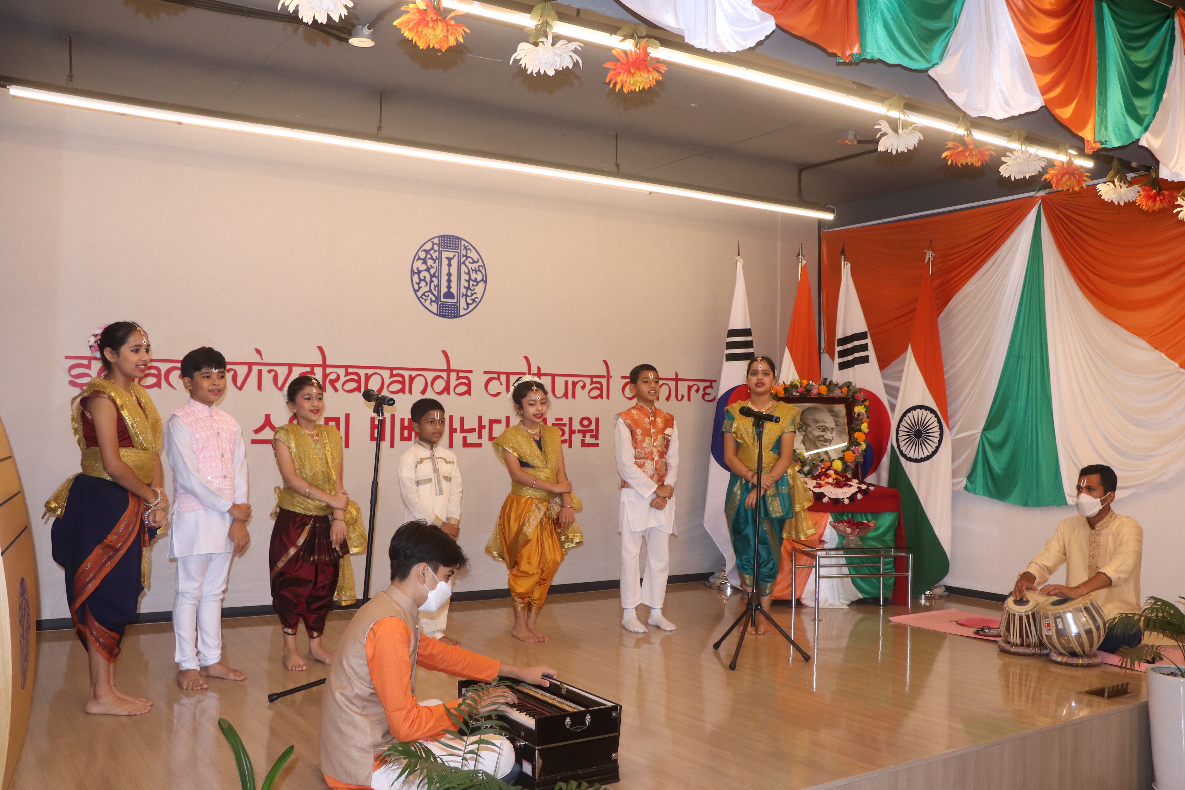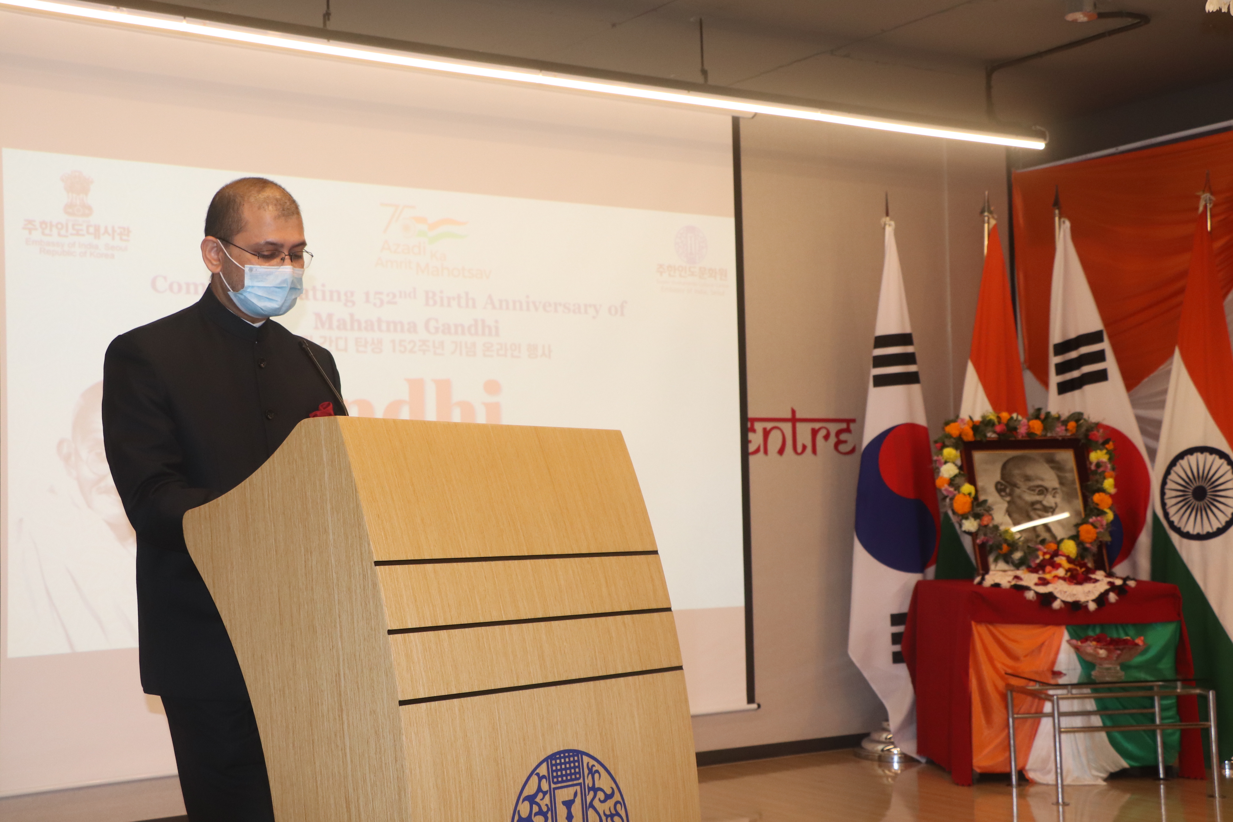 The Embassy of India, Seoul and Swami Vivekananda Cultural Centre (SVCC) celebrated the 152nd birth anniversary of Mahatma Gandhi in hybrid format on 2nd October 2021 where families of the Embassy joined physically and the Indian communities and friends of India in Korea joined online. The event started with floral tributes to the Mahatma Gandhi. Deputy Chief of Mission (DCM) Mr. Surinder Bhagat gave remarks on Gandhi’s thoughts and ideals which are timeless and remain relevant in today’s world. It was followed with cultural performances by the families of the Embassy officials and staffs, including musical and dance recitals. A special address by Dr. Shobhana Radhakrishna on “Mahatma Gandhi’s Global pursuit of Truth, Non-Violence and Peace’’ was also screened on this occasion. The programme continued with DCM paying tribute to the Gandhi bust installed at International Campus, Yonsei University located at Incheon, along with SVCC Director and Head of Chancery.