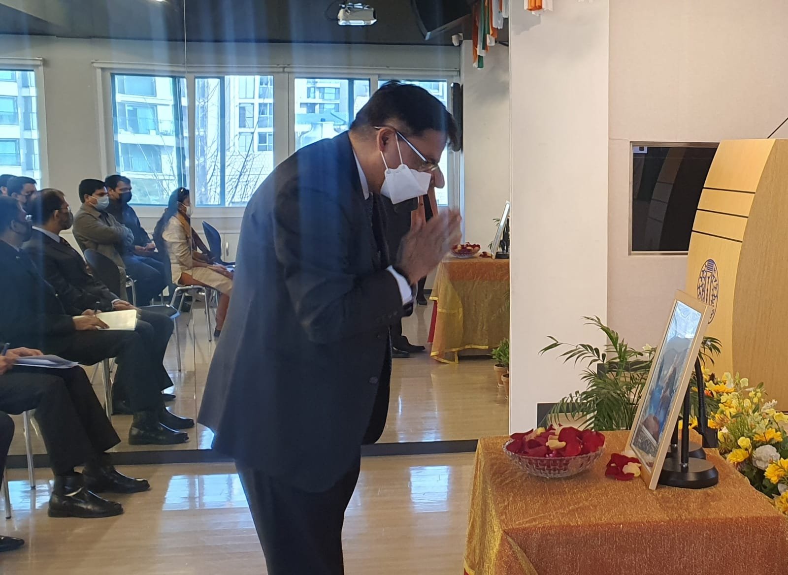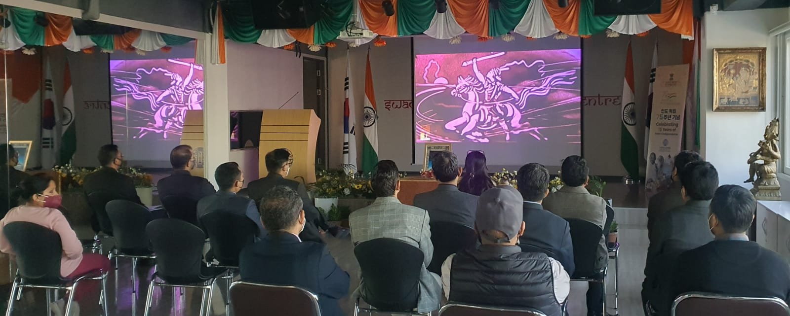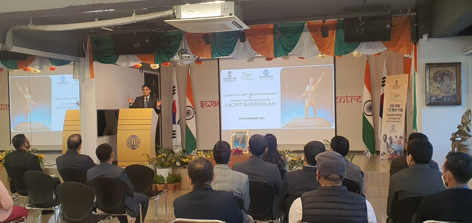 Ambassador H.E. Amit Kumar paid floral tribute to the legendary warrior from India, Lachit Barphukan on his 400th Birth Anniversary Celebrations organized at Swami Vivekananda Cultural Centre, Embassy of India, Seoul. He also spoke about courage & patriotism of this great Ahom army general from north-eastern India who played a key role in defeating the mighty Mughal Empire in the Battle of Saraighat in 1671. A documentary on life & times of Lachit Barphukan was also screened on this occasion.