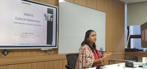 As a part of outreach activity under Azadi Ka Amrit Mahostav, interactive session was organised at Dongguk University. Dr. Sonu Trivedi, Director of Swami Vivekananda Cultural Centre Seoul gave a lecture on India's Cultural Diplomacy & Indo-Korean Cultural Connections.