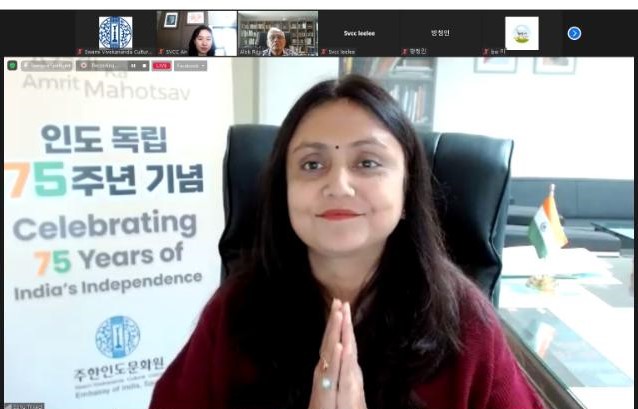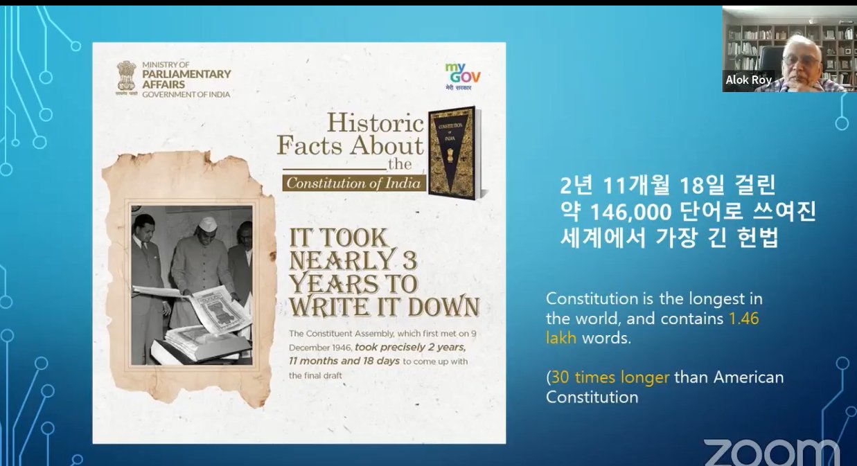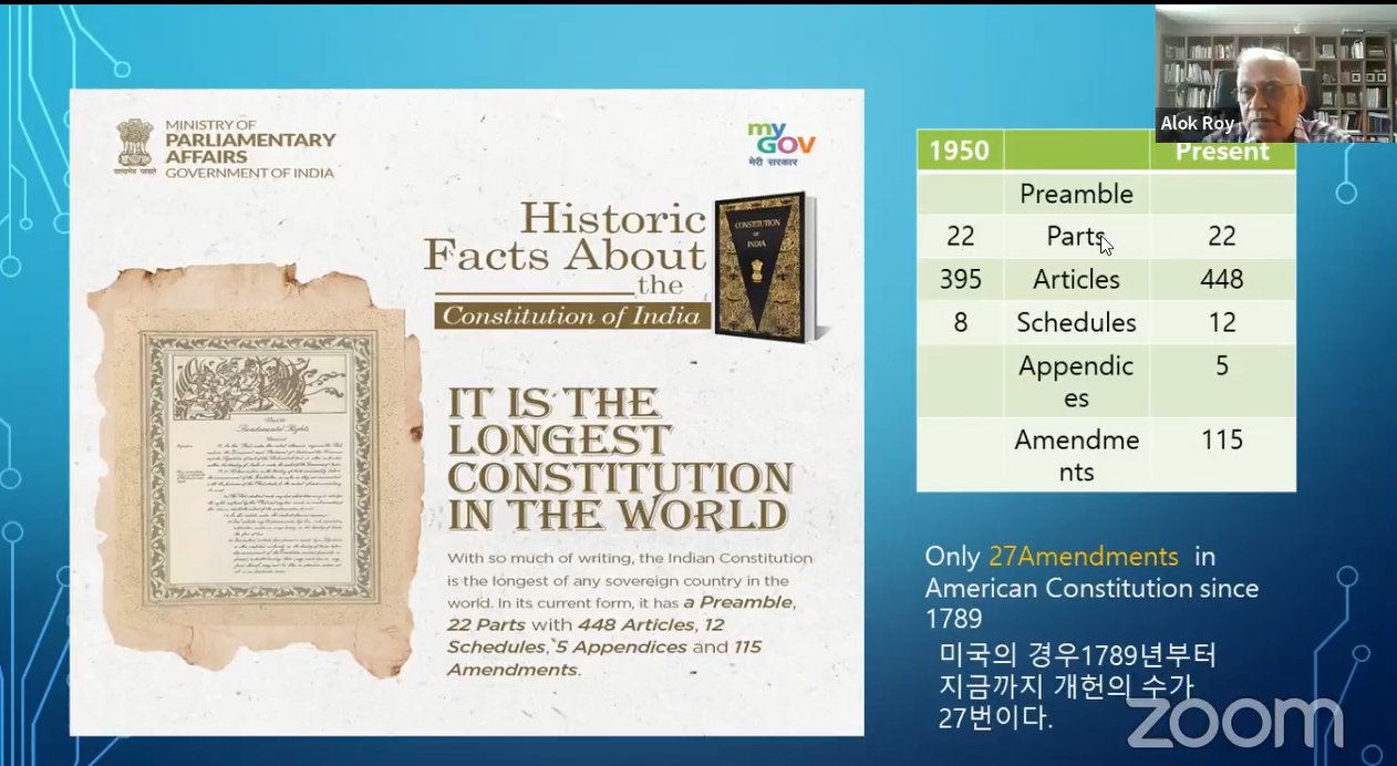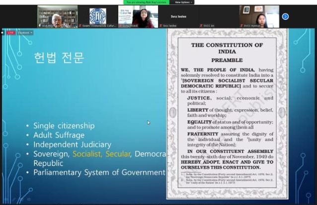 Special online Lecture on Indian Constitution was organised by SVCC, Seoul. Prof. Alok Roy, Professor Emeritus, Busan University of Foreign Studies shared basic facts and ideas enshrined in the Constitution of India and its working over the past seven decades. Director, SVCC, Seoul, Dr. Sonu Trivedi gave opening remarks outlining India's constitutional journey & its learning experiences for the scholars and policy makers in Republic of Korea.