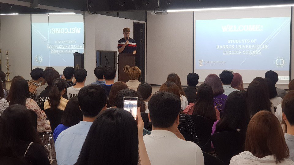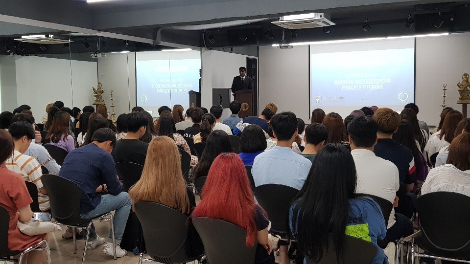 50 plus undergraduates from Hankuk University of Foreign Studies pursuing career related to India visited Embassy of India earlier today for an interaction programme and had insightful discussions with Deputy Chief of Mission Mr. Satish Sivan on India-Korea relationship, opportunities for both countries especially for students and younger generations in each other's country. DIscussions were followed by Q&A and quiz on India and Gandhi.