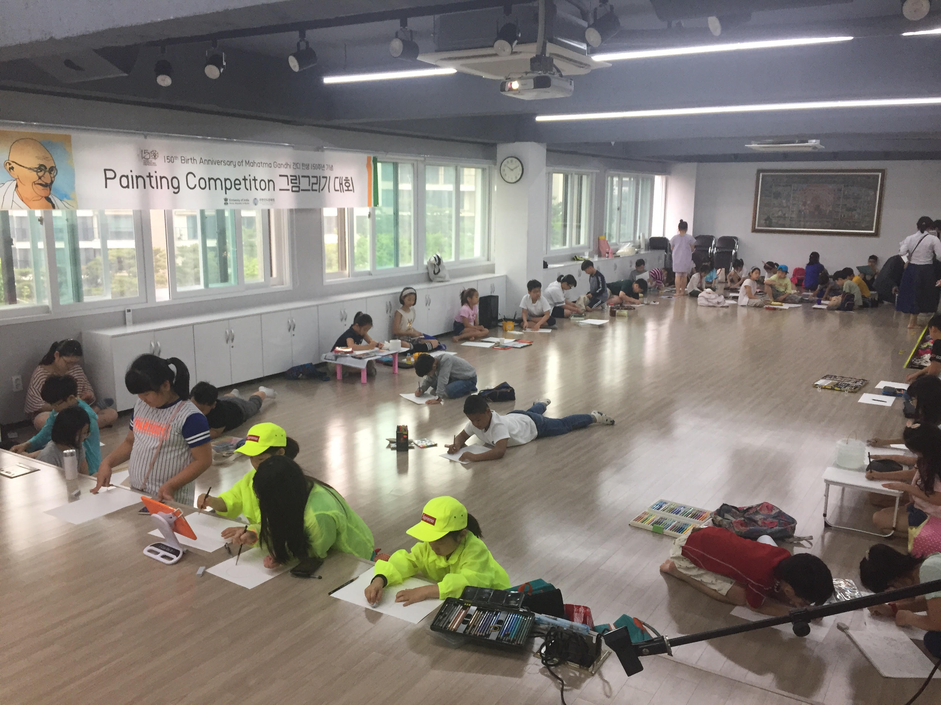마하트마 ê°„ë”” íƒ„ìƒ 150ì£¼ë…„ì„ ê¸°ë…하여 6ì›” 6ì¼, 초등학ìƒë“¤ì„ 대ìƒìœ¼ë¡œ 그림그리기대회가 ì§„í–‰ë˜ì—ˆìŠµë‹ˆë‹¤. 약 50ì—¬ëª…ì´ ì°¸ê°€í•˜ì˜€ìœ¼ë©° 2층 강당ì—서는 참가 í•™ìƒ ë¶€ëª¨ë‹˜ë“¤ì„ ìœ„í•´ 'íž˜ì„ ë‚´ìš” 문나 형님 (Lage Raho Munna Bhai)'ì´ ìƒì˜ë˜ì—ˆìŠµë‹ˆë‹¤.