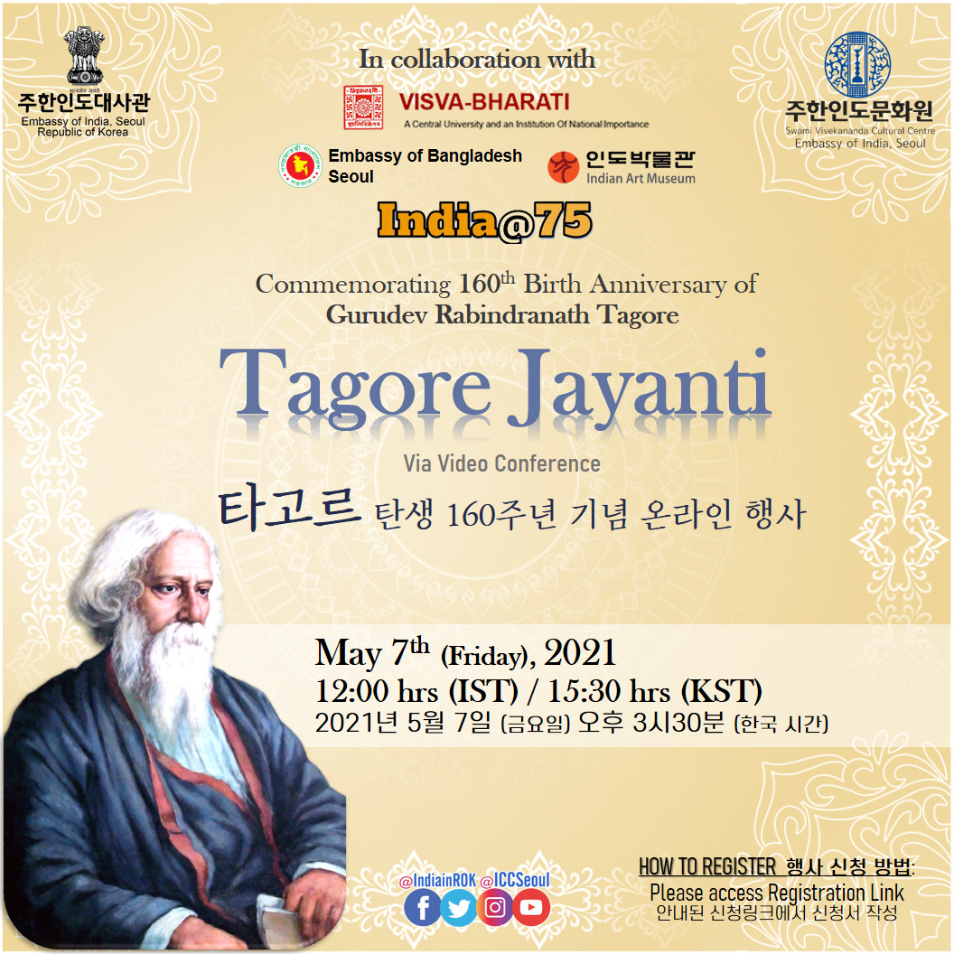 주한인도대사관과 주한인도문화원은 인도 VISVA BHARATI, 주한 방글라데시대사관과 함께 라빈드라나드 타고르 탄생 160주년 기념 온라인 행사를 개최합니다.