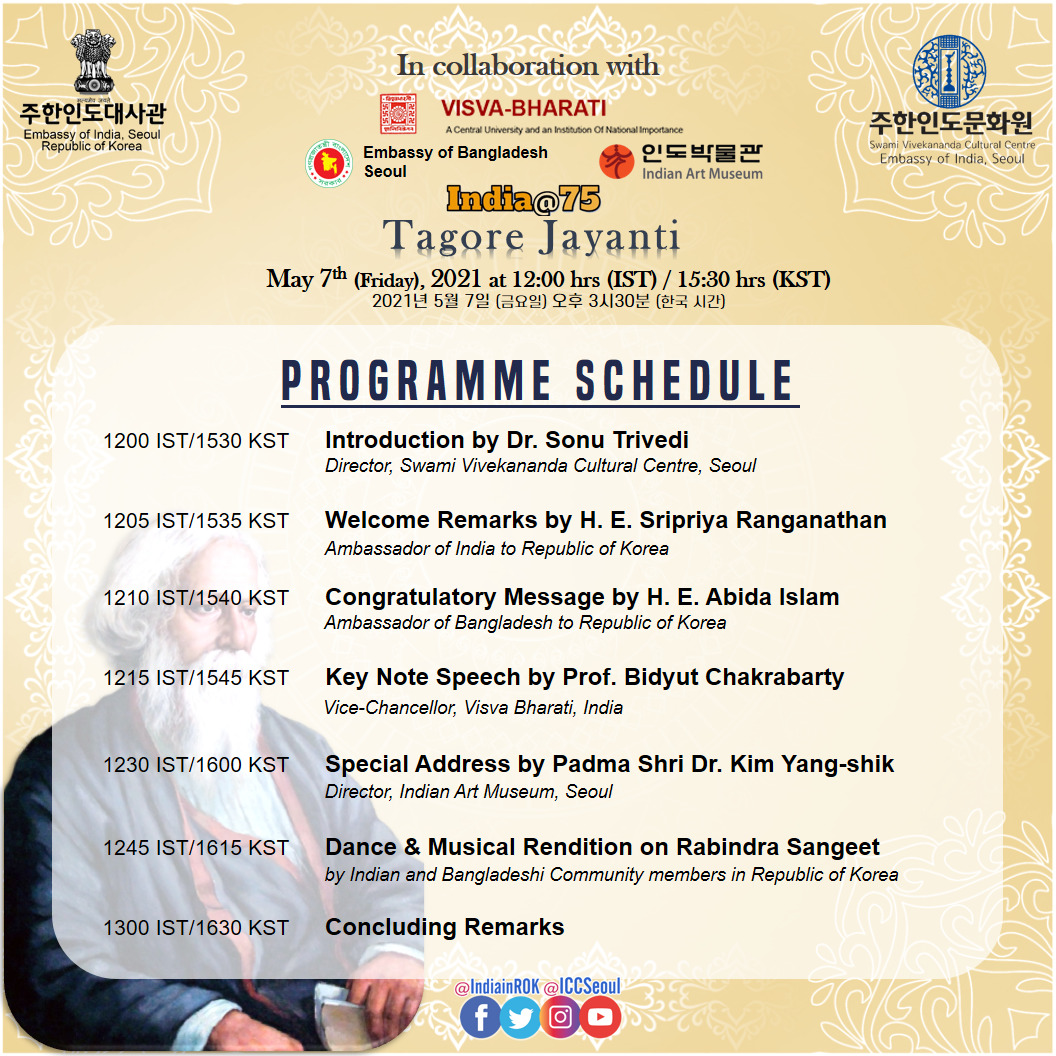 Swami Vivekananda Cultural Centre, Embassy of India, Seoul in association with VISVA BHARATI Santiniketan (India) & Embassy of Bangladesh (Seoul) cordially invites you to Tagore Jayanti on the occasion of 160th Birth Anniversary of Gurudev Rabindranath Tagore.