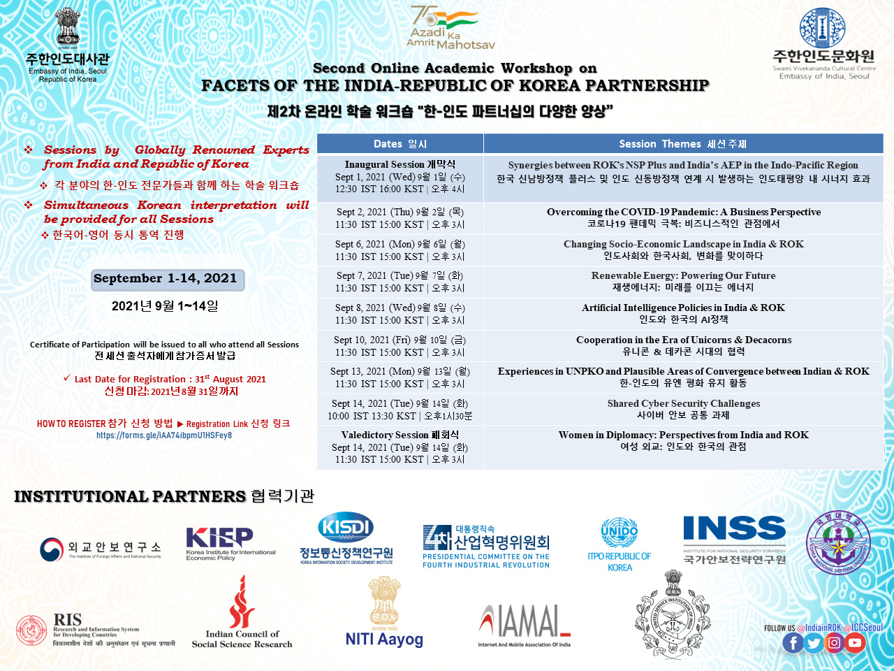 Swami Vivekananda Cultural Centre, Embassy of India, Seoul cordially invites you to Online Academic Workshop on "Facets of the India-ROK Partnership" via Video Conference.