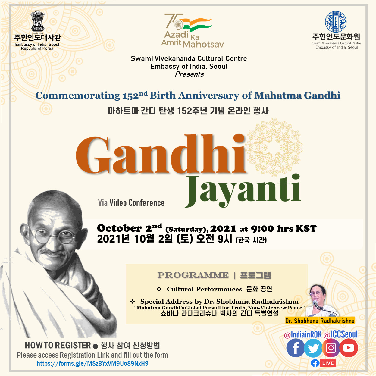 주한인도대사관-주한인도문화원이 진행하는 마하트마 간디 탄생 152주년 기념 온라인 행사에 여러분을 초대합니다.
