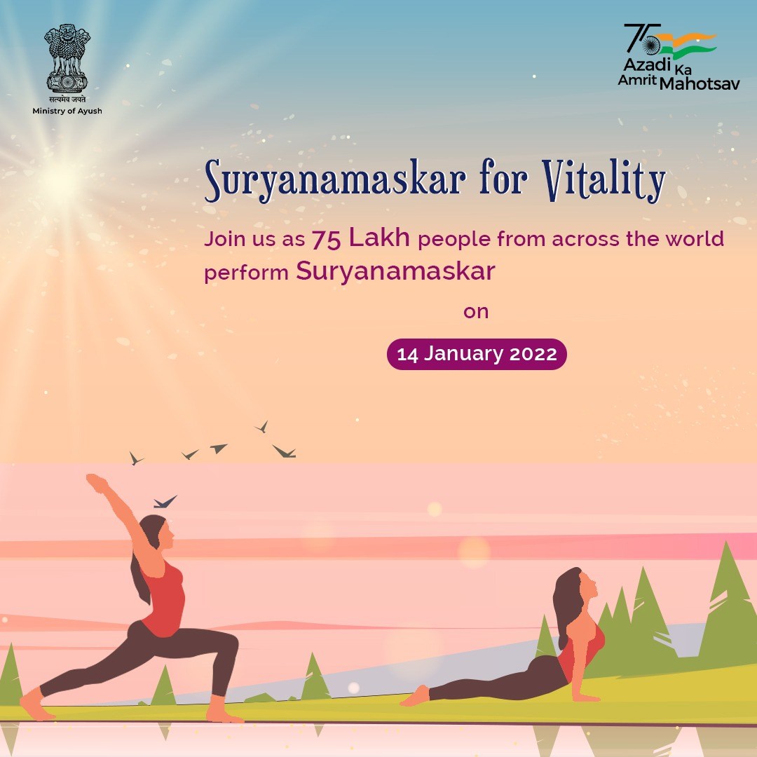 You may be aware that holy Makar Sankranti is the festival of thanksgiving to Mother Nature for spreading health, wealth and happiness around. On this occasion the Government of India has desired that a large virtual Surya Namaskar programme be organized to mark the holy occasion on 14th January, 2022 under Azadi Ka Amrit Mahotsav celebrations. It is planned that 75 lakh people (participants) will practice Surya Namaskar on 14-01-2022 observing COVID appropriate behavior.