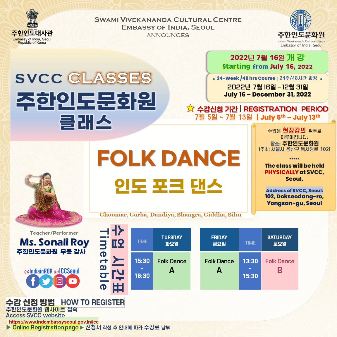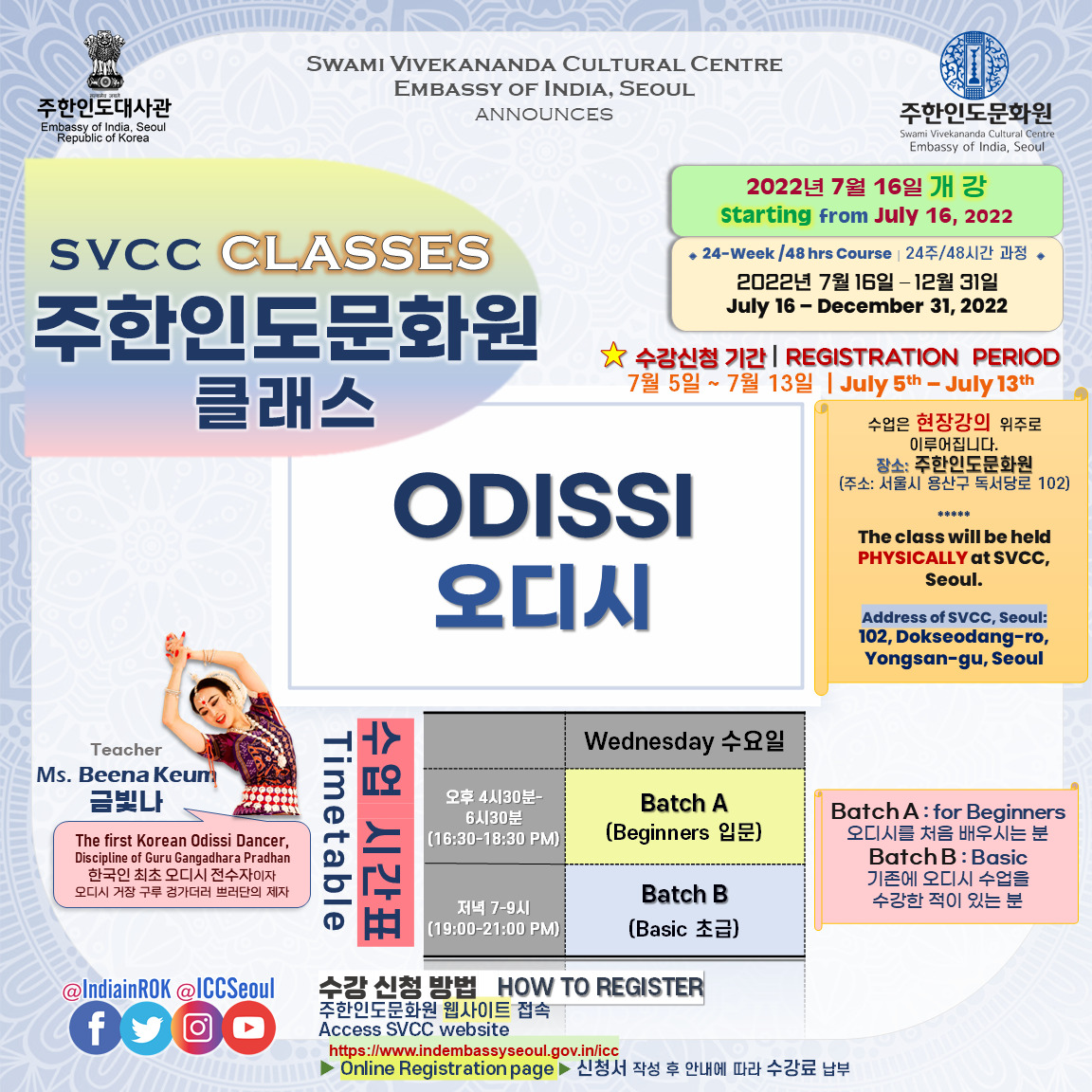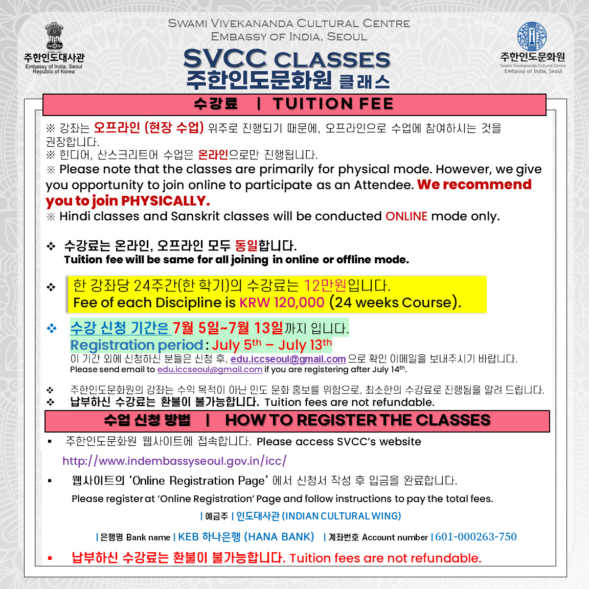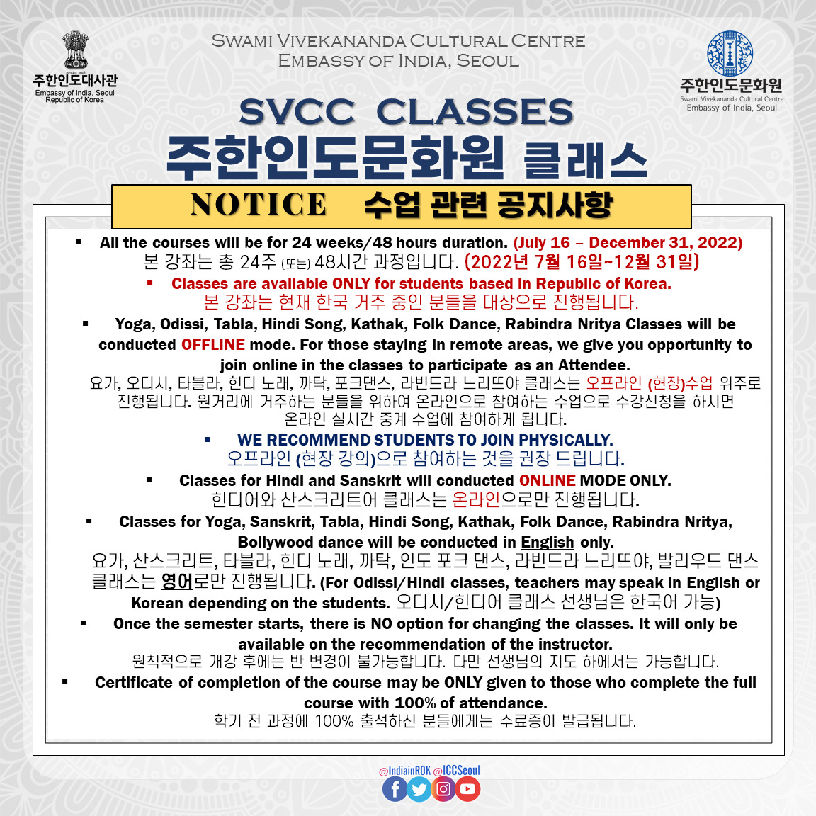 [Notice] 주한인도문화원 클래스 개강 (7월 16일~) 안내 START OF SVCC CLASSES from July 16th