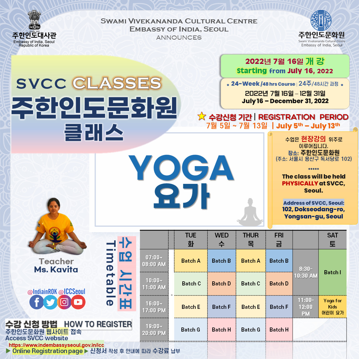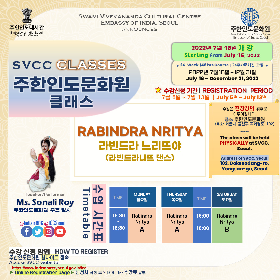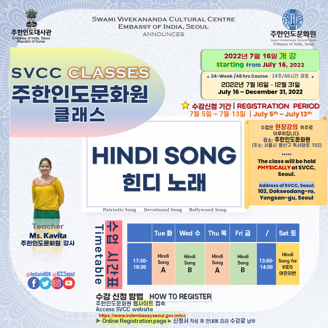 [Notice] 주한인도문화원 클래스 개강 (7월 16일~) 안내 START OF SVCC CLASSES from July 16th