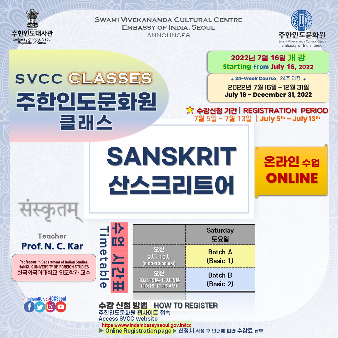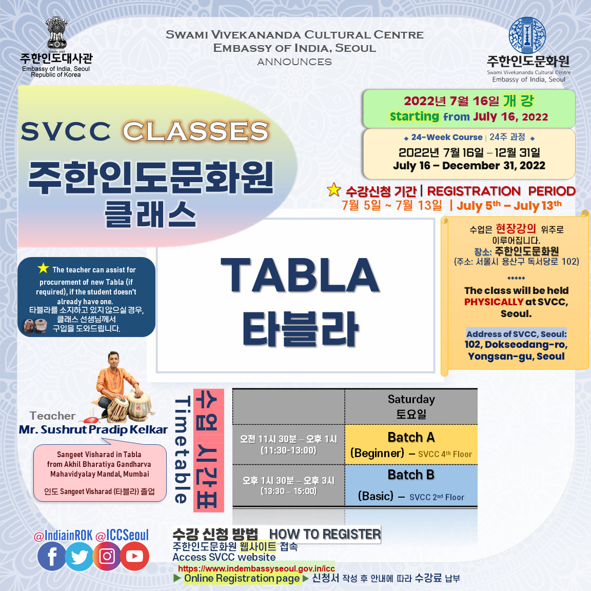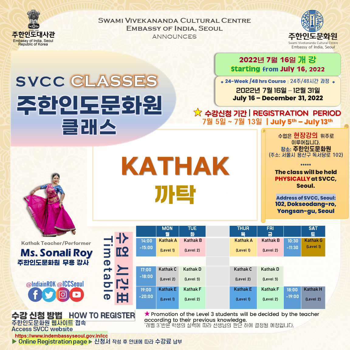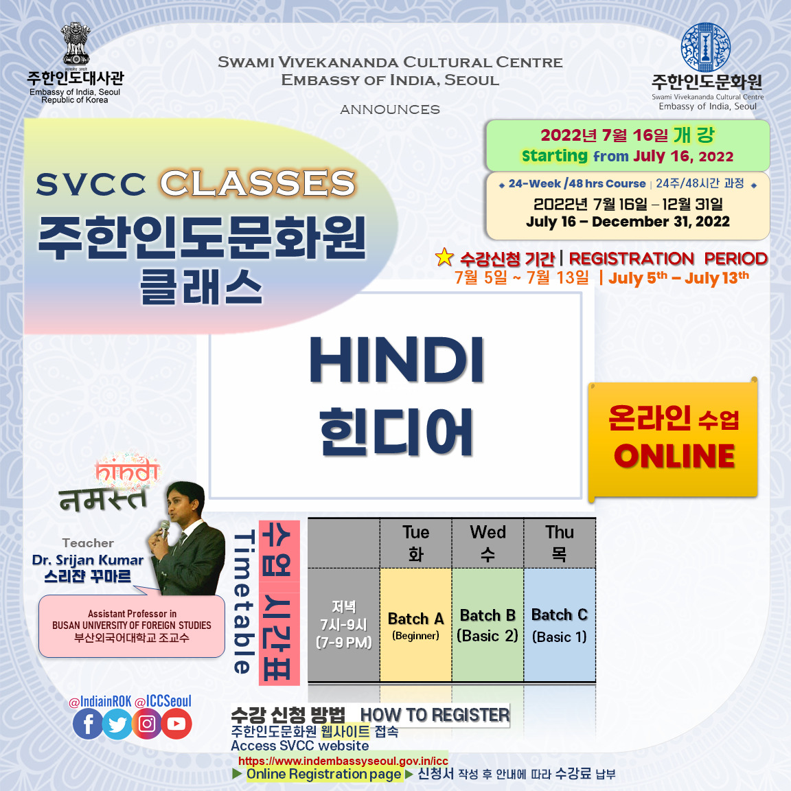 [Notice] 주한인도문화원 클래스 개강 (7월 16일~) 안내 START OF SVCC CLASSES from July 16th