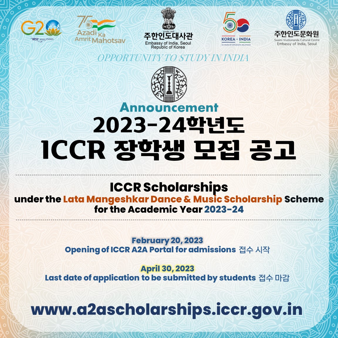 2023-24학년도 인도 문화를 전공할 ICCR 장학생을 모집합니다.
