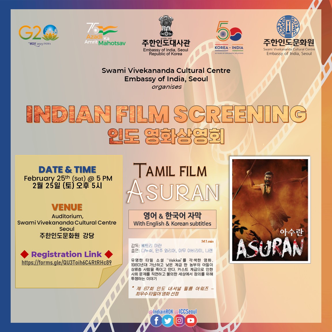 Swami Vivekananda Cultural Centre, Embassy of India, Seoul organises Indian Film Screening - 'ASURAN'.