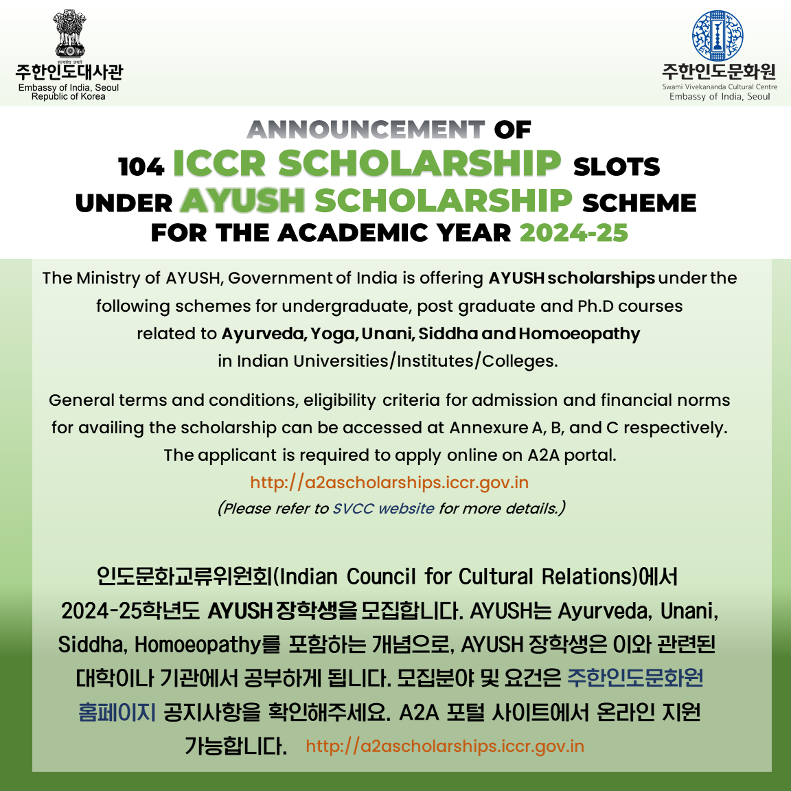 ANNOUNCEMENT OF 104 ICCR SCHOLARSHP SLOTS UNDER AYUSH SCHOLARSHIP SCHEME FOR THE ACADEMIC YEAR 2024-25:2024-25 학년도 AYUSH 장학생 모집안내