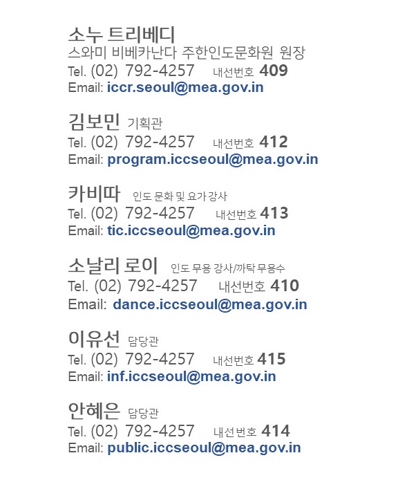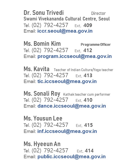| [Address] Indian Cultural Centre, Seoul 102, Dokseodang-ro, Yongsan-gu, Seoul Republic of Korea (04420) [Websites/SNS] - Website: www.indembassyseoul.gov.in/icc - Facebook: www.facebook.com/ICCSeoul - Instagram: www.instagram.com/iccseoul - Twitter: www.twitter.com/iccseoul - YouTube: www.youtube.com/iccseoul [Contact] For more information, please contact: Tel: 02) 792-4257/8 Fax : 02) 795-4258 -Enquiry related to class registration, activities (workshop, lecture series, cultural programme and other events in SVCC): extension number 414 or 415 |