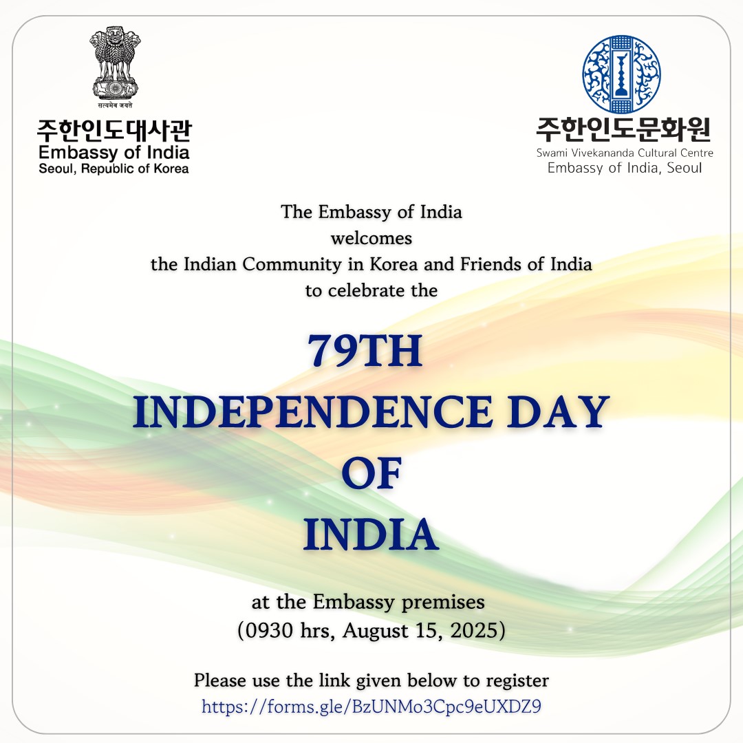 Embassy of India, Seoul welcomes members of the Indian Community & Friends of India to join the 79th Independence Day celebrations.